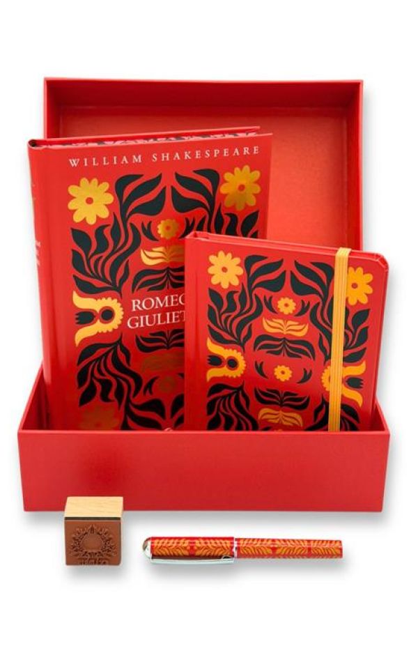Questo cofanetto contiene Romeo e Giulietta e i Sonetti d'amore in una veste elegante e raffinata, insieme a un taccuino, a una penna e a un timbro per rendere unico ogni libro della tua biblioteca.